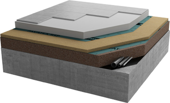 Komplettsystem eines Bodenaufbautes für Beton oder Ziegeldecke. Ober der Dämmung kann ein Nassestrich verlegt werden.