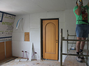 Der Dachaufbau besteht aus flexibler Holzfaserplatte NATURAFLEX mit NATUREPLUS Zertifizierung, welche zwischen den Rofen verlegt wird. Auf der Innenseite der Dämmung wird eine variable Dampfbremse proclima INTELLO PLUS verlegt. Der Feuchtetransport wird auf der Innenseite erfolgen.