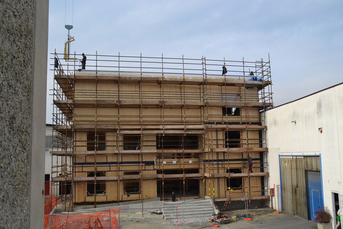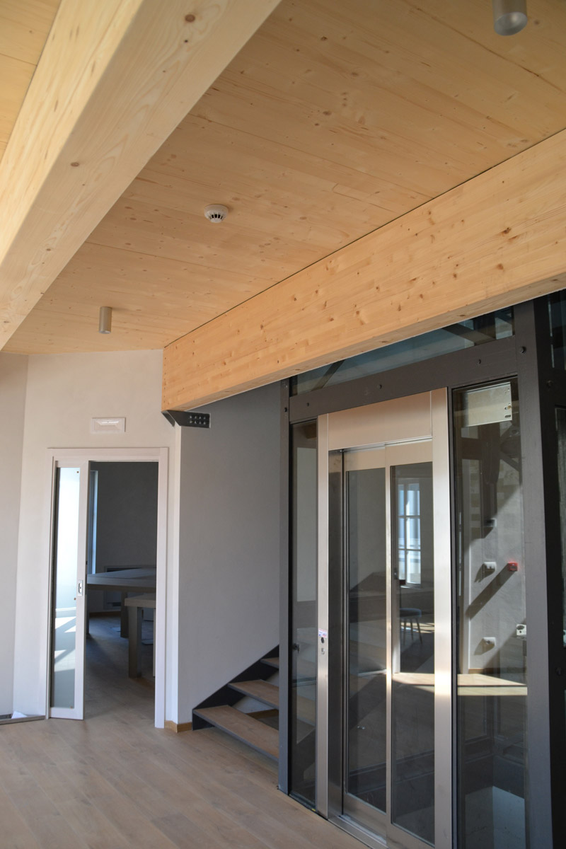 La struttura consiste in una scatola portante in pannello massiccio X-Lam e portali in acciaio e legno lamellare. Per le pareti è stato impiegato il BBS 125 e il BBS XL sp. 100 mm; per i solai il BBS 125 sp. 160 mm qualità a vista. Ad ogni piano viene ripetuto uno schema strutturale a portale realizzato con travi BHS in legno lamellare connessi con spinotti in acciaio inox ai pilastri in acciaio. Con questo sistema la libertà in pianta è assicurata e le partizioni interne gestite con flessibilità e autonomia. La copertura è stata realizzata con travi BHS sbiancate GL28h.