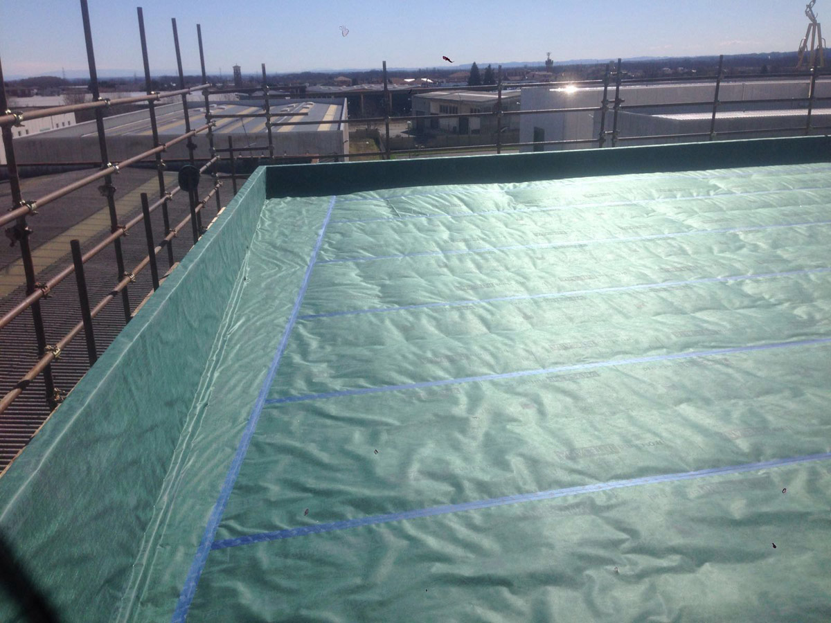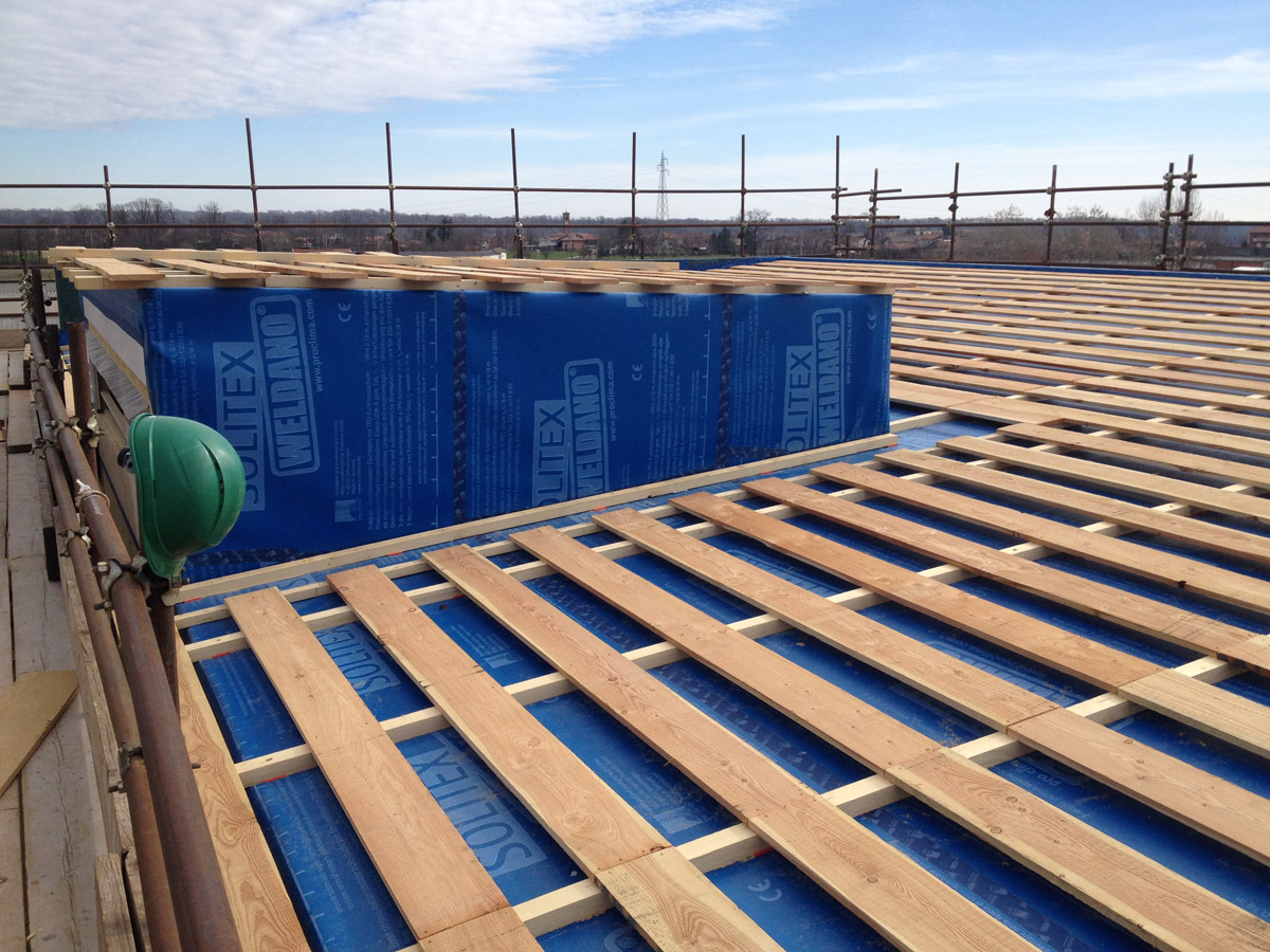 Il pacchetto di copertura è composto da un tavolato in abete sp. 30 mm, un freno al vapore Proclima Intesana, un doppio strato di fibra di legno Pavatherm Pavatex sp. 100 +100 mm, λ 0.038 e ρ 110 kg/m3 e uno strato in fibra di legno Swissisolant Pavatex sp. 19 mm λ 0.046 e ρ 230 kg/m3, una membrana sottotetto aperta alla diffusione Solitex Weldano, listelli di ventilazione in abete su cui è posato un tavolato discontinuo per il fissaggio della lamiera di copertura. La copertura raggiunge così un valore di trasmittanza termica pari a 0,16 W/m2K e oltre 12 ore di sfasamento termico.
