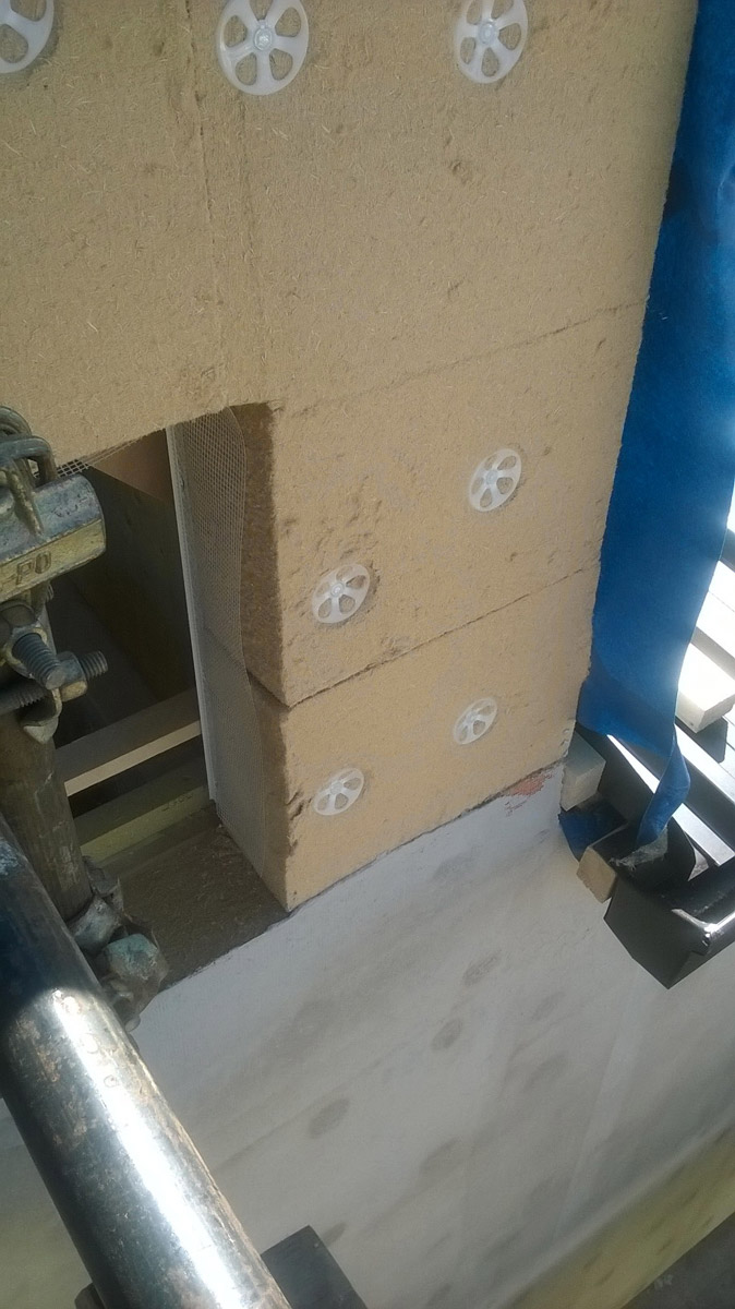 La composizione della parete perimetrale è stata proposta secondo pacchetti isolanti che rientrano nel sistema la Quercia Bioedilizia e Naturalia Bau: il pannello BBS viene rivestito esternamente da un pannello in fibra di legno Pavatex sp. 140 mm, λ 0.038 e ρ 110 kg/m3, intonacato con materiali a base di calce nelle parti rasate (Pavawall) e rivestito da un telo di facciata e pietra naturale su supporto in fibrocemento lastra Powerpanel H2O Fermacell sp. 12,5 mm, nelle parti ventilate (Pavatherm). Internamente la controparete è eseguita con pannello Pavaflex Pavatex sp. 80+80 mm, λ 0.036 e ρ 55 kg/m3 e completata da una lastra in gessofibra Fermacell sp. 12,5 mm.