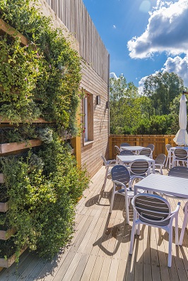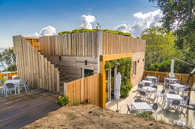 Come rivestimento esterno sono state montate pareti ventilate in legno naturale di colore simile alle piante di leccio che circondano la struttura, sempre per meglio integrare paesaggisticamente l’intero edificio. Oltre alle pareti ventilate in legno, due orti verticali ricoprono in gran parte due facciate dell’edificio per i quali sono state scelte fioriture e piante aromatiche che crescono spontaneamente in questi luoghi. La scelta di piante autoctone e utilizzabili in cucina è frutto della ricerca di una soluzione utile e allo stesso tempo originale e creativa. Un piccolo giardino pensile sulla terrazza racchiude in sé alcune piante della macchia mediterranea per ritrovare e saper riconoscere la vegetazione tipica che circonda la struttura.