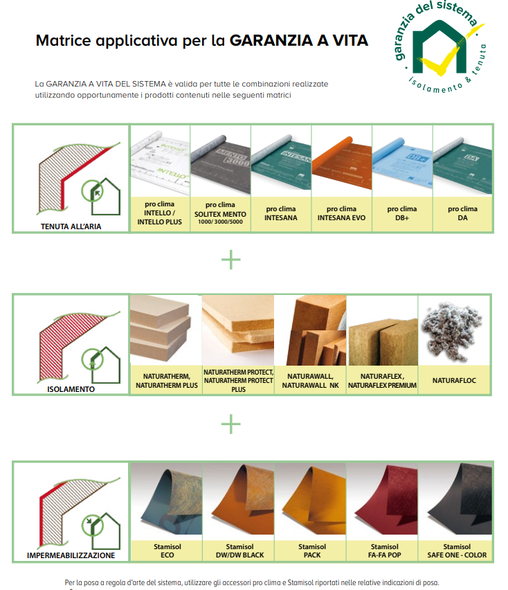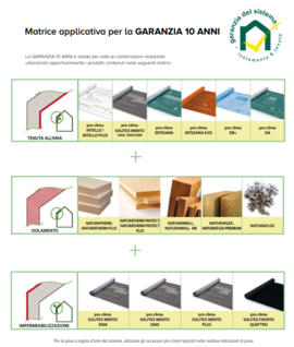 La Garanzia del Sistema di NATURALIA-BAU è valida a tutti gli effetti solo se il sistema sarà integralmente realizzato con l‘utilizzo con i prodotti riportati nella matrice operativa e nel pieno rispetto della posa a regola d‘arte indicata dai produttori. Sarà cura dell’installatore rilasciare l’ATTESTATO disponibile sul sito ed allegare il Certificato di garanzia